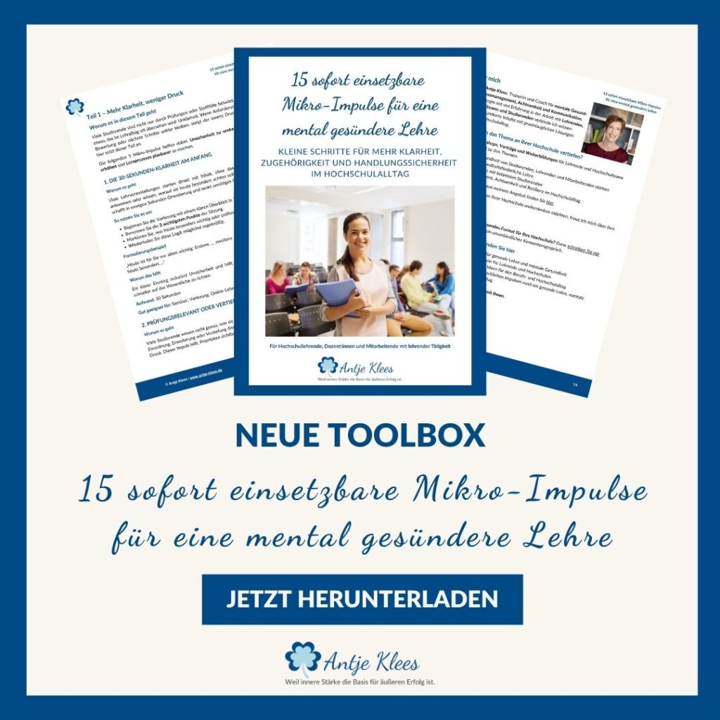 Mit dieser Toolbox erhalten Sie 15 sofort nutzbare Impulse, mit denen Sie Ihre Lehrveranstaltungen klarer, menschlicher und alltagstauglich entlastender gestalten können, ohne zusätzlichen Perfektionsdruck und ohne Ihre Rolle zu verlassen.